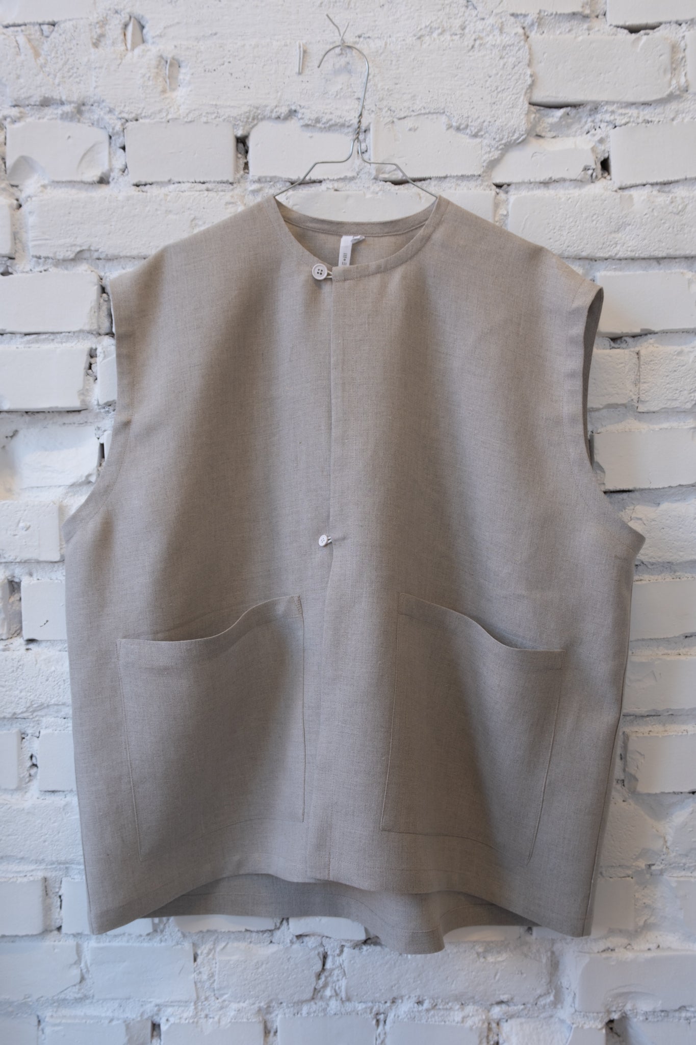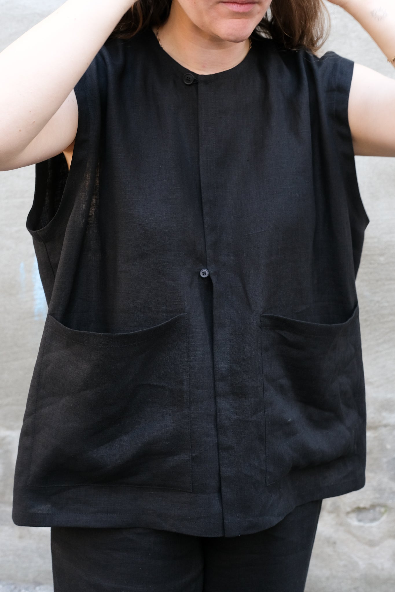 Vesten er en vid, oversize vest med knapper og lommer på front. Et enkelt og brukervennlig plagg. Vesten er kjempefin både som en overdel på varme dager eller som et lag over andre klær, både en t-skjorte og større strikkegensere, enten lukket eller åpen.