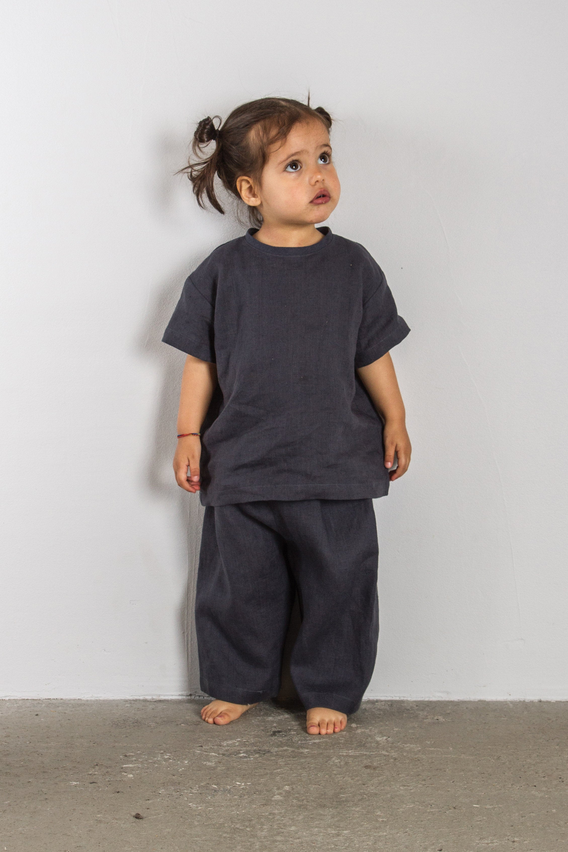 Vi bruker lin hele året. Den vide passformen er perfekt som et svalt lag for å beskytte mot solen i sommerhalvåret eller for å kombinere med flere plagg under når temperaturen synker. Fordi lin er slitesterkt og naturlig flekkbestandig fungerer den også godt som beskyttende lag over mer sarte materialer som fort får hull og flekker.